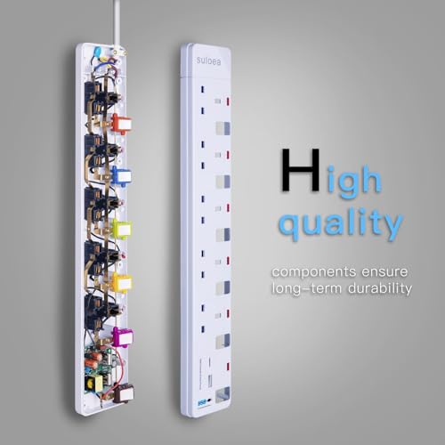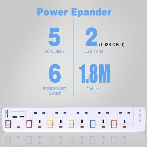 - 【5 Way & 2 USB ports】 1.8Meter UK standard power strip. 5 AC outlets and 2 USB ports,including one USB-C port.