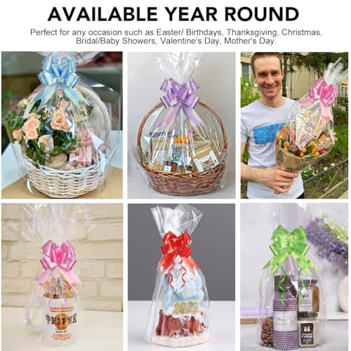 - WIDELY USED FOR EVERY OCCASION: Perfect for Easter, Christmas, weddings, birthdays, baby showers, corporate gifts or daily storage. Use them to wrap hampers, display treats, protect cosmetics or organize toys. These cellophane hamper bags and vibrant pull bows add elegance to any event or purpose.