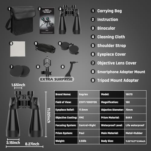 POWERFUL 18X MAGNIFICATION & 70MM LARGE OBJECTIVE— The high powered binoculars with 18X magnification and 70mm large objective lens offer a unique opportunity to experience the world in a new light. They provide a level of detail, clarity, and breadth of view that to satisfy and delight users of all interests