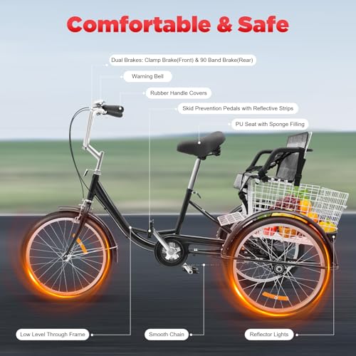 - Superior Comfort & Safety Features: Equipped with anti-skid pedals featuring reflective strips, rubber handle covers, a smooth chain, and a soft PU seat with sponge filling, this tricycle prioritizes your comfort. The low step-through frame, dual brakes, thickened frame, warning bell, reflector lights, reflective strips, two-wheel ground drive, and single-speed chain all contribute to a safer riding experience.