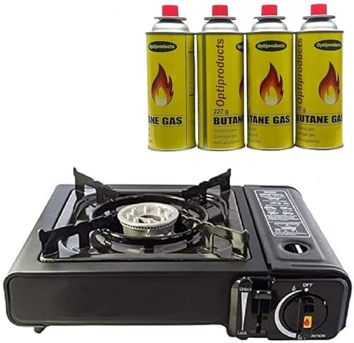 - 220g Butane Gas Canisters and Portable Camping Gas Cooker Stove Single Burner Butane BBQ Caravan Outdoor Party Stove comes with Carry Case Stove 4 x Canisters