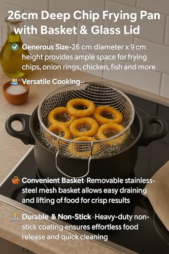 - ✅ Generous Size – 26 cm diameter × 9 cm height provides ample space for frying chips, onion rings, chicken, fish and more 🍟🍤