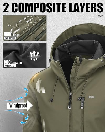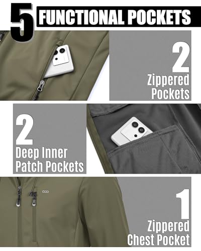 - Multifunctional pockets: The waterproof softshell jacket with hood has 5 functional pockets:2 outer pockets with soft fleece lining provide better heat protection for your hands and are large enough for gloves, large phone, etc. 2 inner patch pockets are deep to keep your wallet and keys safe. 1 chest pocket for better storage.