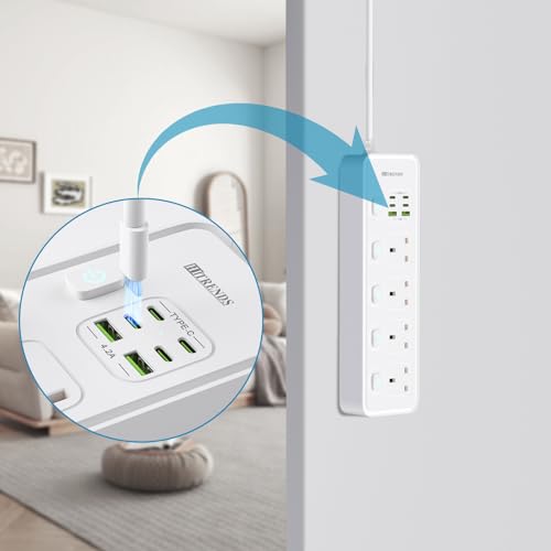 - 【Fast Charging & Multi-Device Support】 Equipped with 2 USB-A (5V/4.2A max) and 4 Type-C ports, this 4 Way Gang Extension Lead with USB Slots delivers efficient charging for smartphones, tablets, and other USB devices. Power up to 10 devices simultaneously without clutter