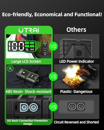 6500A 27000mAh Jump Starter Power Pack with Compass/10W Wireless Charger/Safety Hammer/LED Flashlight/160DC OUT with LCD Display,UTRAI Car Battery Booster Jump Starter for All Gas/12L Diesel