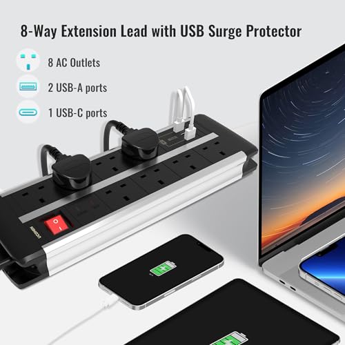 - 8 WayExtension Lead: Offers 8 UK plug sockets to power multiple devices simultaneously, perfect for home, office, and dorm use.