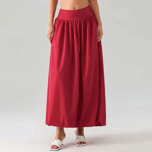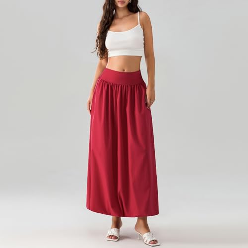 Achlibe Women Summer Bubble Maxi Skirt Casual Elastic Waist Pleated A-Line Long Skirt Beach Balloon Skirt with Lining (A-Red, XL)
