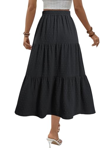 Adigaber Women's Long Skirts Elasticated High Waist Flowy Maxi Skirt Swiss Dot Casual Boho Skirts with Pockets and Drawstring Black