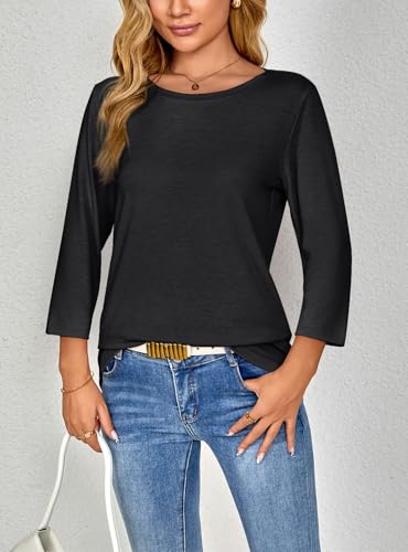 AirMood Womens 3/4 Length Sleeve Shirts Tops Casual Loose Fit Crewneck T-Shirts Basic Blouses (Black,S)