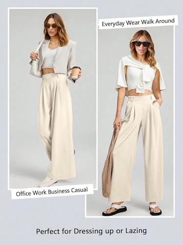 Aleumdr Palazzo Wide Leg Trousers for Women Elastic High Waist Flared Culottes Pants with Pockets Beige L