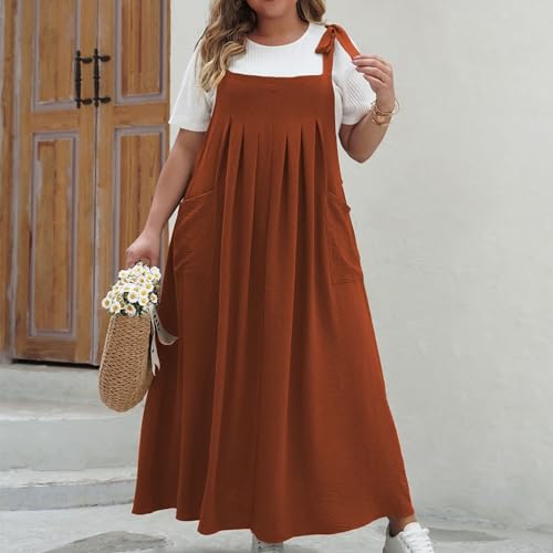 AMhomely Ladies Plus Size Sleevless Linen Summer Dress Pinafore Dungarees Dress Sloid Color Loose Fit Flared Swing Dress Casual Plain Pleated Maxi Dress,000 Brown,4XL