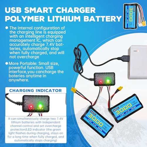 AMZZN 2PCS 7.4V 3000mAh 15C 2S XT-30 Plug Li-ion Battery with 2-in-1 Charger for RC High-Speed Cars, Trucks RC Ship Model Car and Huina Engineering Vehicle Batteries