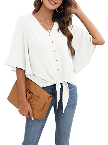 - MATERIAL: Tie Knot Front Blouses for Women. Chiffon 3/4 Bell Sleeve Tops, 100% Polyester, Soft, Lightweight, Breathable fabric and Comfortable to wear. suitable for any body shape, provide you an excellent touch!