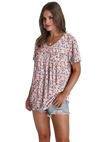 Aokosor T Shirts for Women Summer Tops Ladies Blouses Short Sleeve Pleated Dressy Casual V Neck Loose Tee Size 14-16 Pink Floral