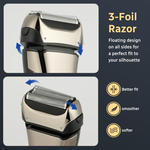 - 【High-Quality Triple Blade Heads】: Our electric shaver is equipped with ultra-thin, hypoallergenic triple titanium foil. The precision-engineered foil glides effortlessly over the skin, achieving a close shave comparable to the most careful traditional razors. The three mesh blade heads can also move independently to ensure perfect fit to facial contours, even in hard-to-reach areas. This maximizes contact with the skin without irritating it.