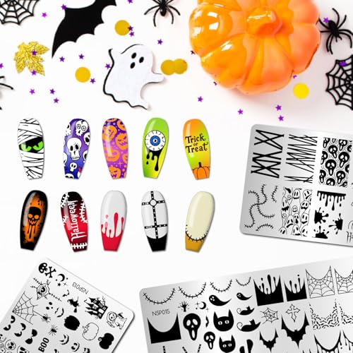 - Versatile Halloween Designs: Features 3 steel plates with classic horror motifs: Plate 1 (Mummy, Pumpkin, Cobweb, Bats, Skeleton, Ghost, Negative Space Ghost, Blood Splatter), Plate 2 (Mummy, Ghost, Wounds, Blood Drops, Black Cat, Cross), Plate 3 ( French Tips with different halloween elements such as Bat, Cat, spider web, Blood, Wound, ghost negative space)