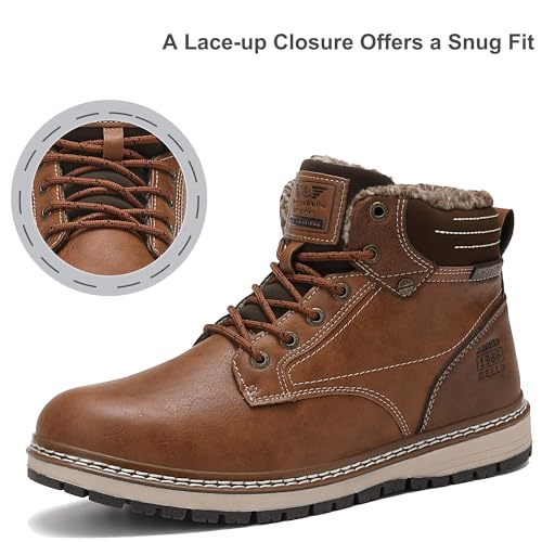 ASTERO Men Boots Snow Boots Mens Winter Boots Men Lace up Fur Warm Lined Mens Leather Boots Ankle Boots Brown Size 10.5