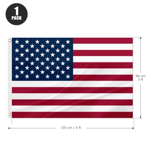 - Packing: The package includes one 90×150 cm American flag.The edge of the flag is double-stitched and reinforced with a canvas header and two brass grommets.