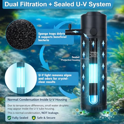 - 【Efficient Filtration for Small to Medium Tanks】: 500 L/H internal filter with UV sterilizer supports circulation and helps reduce green water, algae and cloudiness in 50–125L aquariums.