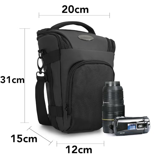 - The bag can be opened away from the body, thanks to the practical double zip. Carry handle, shoulder strap (padded), high wearing comfort thanks to additional lap strap. Nothing flops and slags here! Even if you bend forward, the bag stays where it is. This is a particularly interesting feature, as the body and lens like to weigh a few kilos