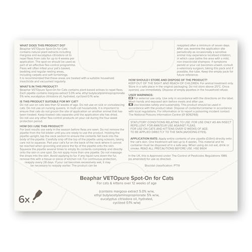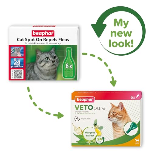 Beaphar – VETOpure Flea Spot On for Cats, 6 pipettes –Plant-Based Protection – Repels Fleas for up to 4 Weeks – Pack Provides up to 24 Weeks Protection – Contains Margosa Extract