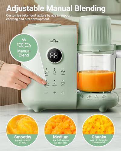 - 𝗔𝗹𝗹-𝗶𝗻-𝗢𝗻𝗲 𝗕𝗮𝗯𝘆 𝗙𝗼𝗼𝗱 𝗕𝗹𝗲𝗻𝗱𝗲𝗿: Say goodbye to kitchen clutter! The Bear baby food blender does it all in one compact device—steam, blend, sterili-ze bottles and warm milk. Simplify your daily routine and create fresh, homemade meals for your little one without the need for extra appliances