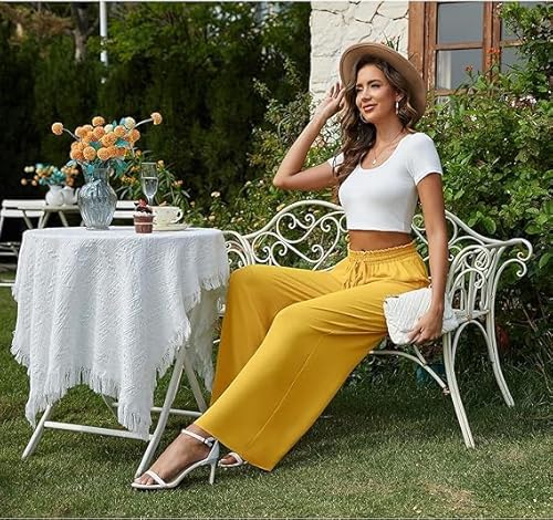 BEIGAI Wide Leg Trousers for Women Lounge Comfy Elastic High Waisted Drawstring Pants Ladies Summer Trousers with Pockets,Light Yellow,L