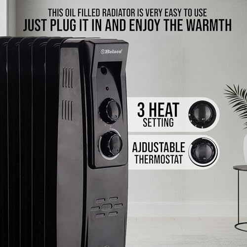 Belaco 2500W Oil Filled Radiator Heater, 11 Fins Portable Electric Radiator with Adjustable Thermostat & Safety Cut-Off, Energy Saving Room Heater for Home & Office – Black