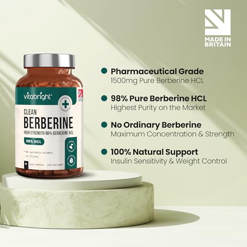 Berberine HCL, 100% Natural & 98% Pure, High Strength 1500mg x3 a Day/Berberine 1000mg High Strength x2 a Day/Berberine 500mg x1 a Day, 90 Capsules, VitaBright Clean Berberine Supplement UK