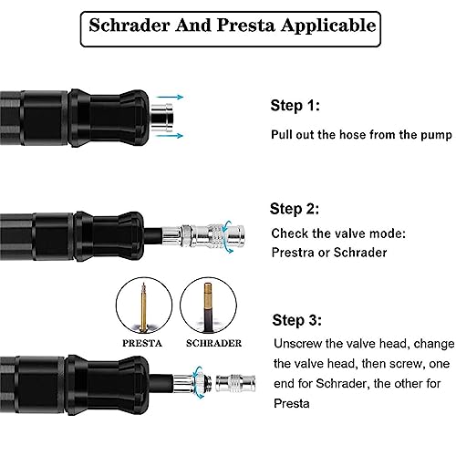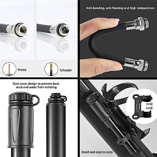 - ✔【Presta and Schrader Compatible 】: This bike pump is compatible with universal Presta and Schrader valves.Flexible air hose design works with awkward or tight valve placements at ease.