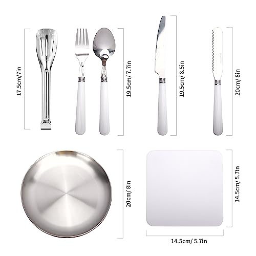 - MULTIPURPOSE – Holds all your essential eating utensils safely in one secure package. Set includes; 2 forks, 2 spoons, 2 knives, 1 butter knife, 2 8" Stainless Steel dinner plates, 1 cutting board and 1 tongs.