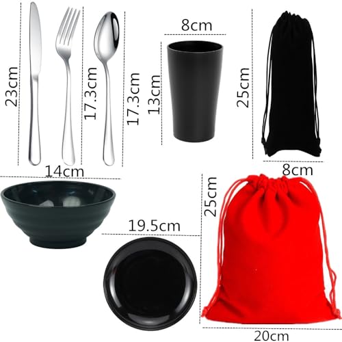 - 【Package List】: You will get a nice set of cutlery, the set includes 2 x Bowls, 2 x Large Round Plates, 2 x Cups, 2 Fork, 2 Knife, 2 Spoon, 2 x Drawstring Carry Bag.