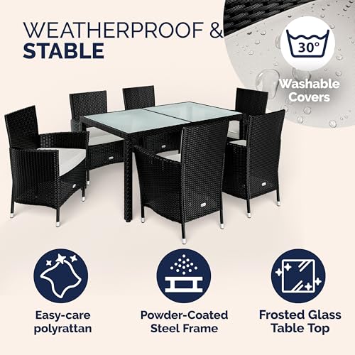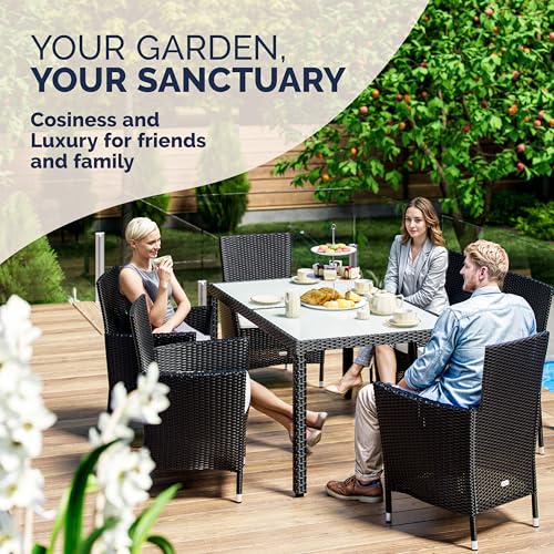 In day to day use, this set is designed to make outdoor dining feel practical and straightforward. The 150 x 90 cm table gives you enough room for family meals, drinks, and shared serving items, while the six armchairs help create a full dining setup for regular social use. One of the strongest practical features is the stackable chair design, because it makes the set easier to store and manage than many larger patio dining sets with fixed chairs. The rectangular glass top keeps cleaning simple after meals or drinks, and the black rattan style finish with cream cushions gives the whole setup a more polished look for a garden, terrace, conservatory, or balcony.