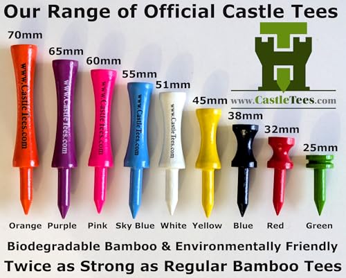 - 4. 🏌️ ✔️ Castle Tees are coloured from top to bottom in the same colours as their plastic counterparts and the same sizes that you’re used to using, making them easier to find around the Tee Box and saving you time having to fumble about in your Golf Bag looking for the size you want to use. Castle Tees are a great way of improving consistency off the tee ensuring the ball is teed up at the same height every time.