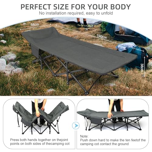 CHENDY Camping Beds for Adults, 74.8 x 26.7'' Extra Wide Camp Bed with Cushion and Side Pocket, Portable Travel Camping Cot for Travel Fishing Outdoor Picnic Office Indoor with Carry Bag,450 lbs