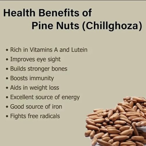 - 🌰 Naturally Satisfying Snack Option: Enjoy the rich, nutty flavor of Chilgoza pine nuts—known for their crunchy texture and naturally occurring nutrients. A great pick for on-the-go snacking, trail mixes, or a unique twist in your favorite recipes.