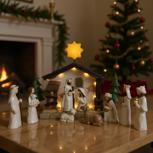 WANCHIY Christmas Nativity Scene Set – 13 Pieces Nativity Set with Light-up Manger, The Nativity Story Figures – Christian Christmas Decorations & Figures (Classic)