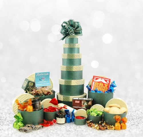 Christmas Treats Gift Tower – Green & Gold 6-Tier Tower with Chocolates, Cookies, Fudge & More – Christmas Hamper for Friends, Family or Corporate Clients