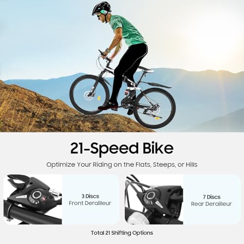 - 【Smooth Driving】The 21 speed gearbox can provide a smooth transmission ratio under all driving conditions. This 26 inch mountain bike features front suspension forks and rear shock absorbers, allowing you to reach your destination without any problems.