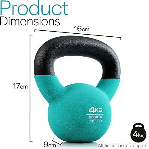 - COLOUR-CODED & LABELLED: The 4kg kettlebell has a teal-coloured neoprene coating and is clearly labelled with its weight to easily identify it from other kettlebells in the Core Balance range. Kettlebells ranging from 4kg to 10kg are perfect for beginners and cardio workouts, whereas 12kg to 20kg kettlebells are great for building strength and bulking up.