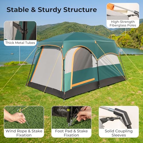 - 【Excellent Ventilation & 360° View】The large family tent features roof vents, 2 roll-up side mesh doors, a large front mesh door, and a mesh windows, providing more airflow while keeping “ unexpected guests” away. Furthermore, the large roof vents allow for exquisite stargazing and stunning view of nature from the comfort of your tent.