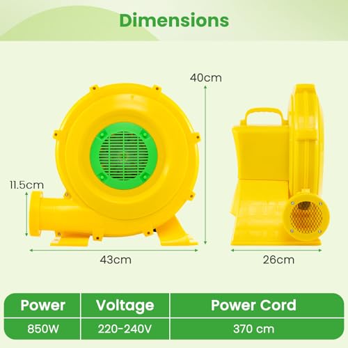 - 【Strong Airflow】The high-performance blower is equipped with a 850W motor for powerful impetus and airflow. With a substantial air volume of 1450 m³/h and a wind pressure of 1880 pa, this blower ensures quick and efficient inflation.