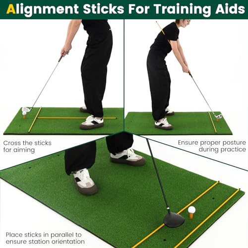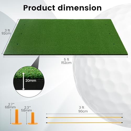 - 【Complete Equipment】The package includes a 5 ft x 3 ft golf hitting mat, 2 rubber tees and 2 golf alignment sticks, which makes this mat a great helper of indoor and outdoor golf practice.