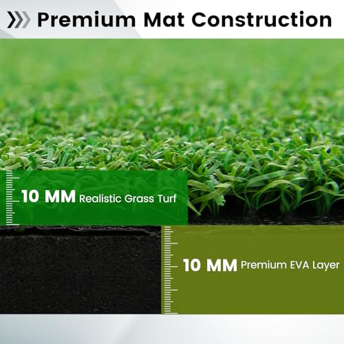 - 【Feel Like Real Grass】This golf hitting mat is constructed in 3 layers: ①synthetic grass turf: simulate real grass turf with a 15/10 mm grass filament length②anti-tearing layer: turf and padding are securely joined with great cushioning③EVA bottom: high-elasticity and non-slip.