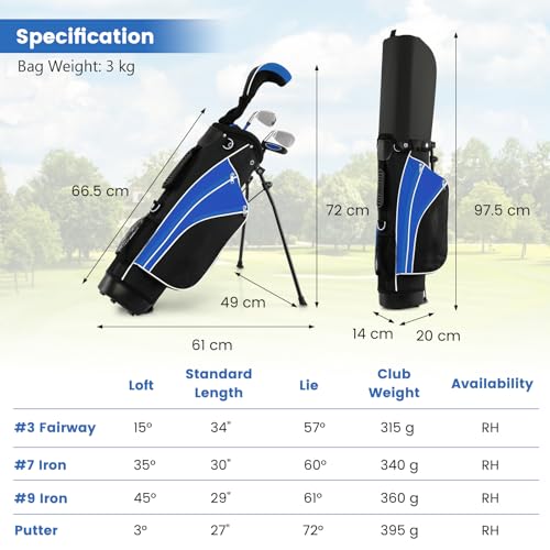 COSTWAY Junior Golf Clubs Package Set with 3# Fairway Wood, 7# & 9# Irons, Putter, Head Cover and Stand Bag, Right Hand (Age 8-10, Blue)