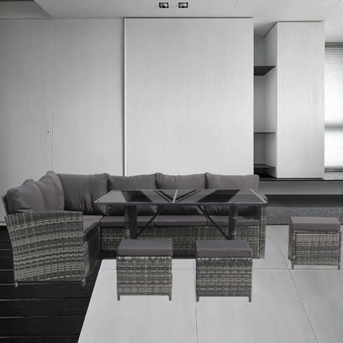 This is a 9 seater rattan corner sofa set designed for outdoor lounging, casual dining, and social seating in gardens, patios, backyards, and similar spaces. Compared with a smaller patio set or compact bistro set, it gives you much more seating capacity and a proper dining table, making it better suited to family use or entertaining guests. It is built for people who want one furniture set that can handle both laid back relaxation and practical outdoor dining. Users often choose this type of set over simpler options because it creates a more complete outdoor living area with room for more people.