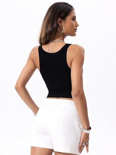 Danysu Women Cotton Rib Tank Top with Built in Bra Square Neck Crop Tank Fitted Basic Tops Black Solid M