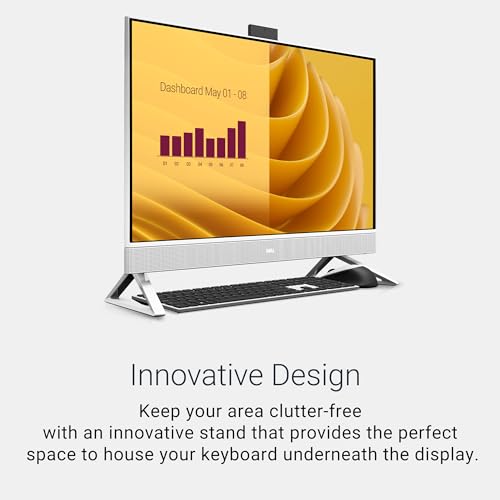 This model features a clean, modern white chassis with a fabric speaker grille and an isosceles stand that keeps the footprint compact. Dell has clearly focused on desk organisation, including the ability to store the keyboard neatly under the display when not in use.