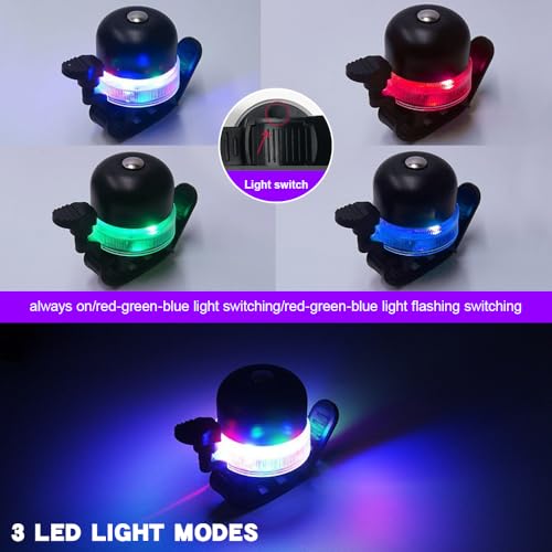 - 【Lighted Design】This bike bell offers three lighting modes: continuous colorful light, and flashing red, green, and blue options, These lights add a bright splash of color, improving visibility and keeping you safe on the road.