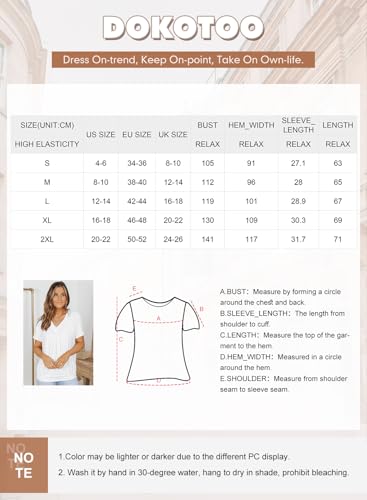 - Package Content: 1 x Women Short Sleeve T-Shirts. Available in sizes S/M/L/XL/XXL. Dokotoo women's summer tops is designed to be a loose fit top, if you want a fitted fit, please size down. Please Refer to the Dokotoo Size Chart before Ordering.